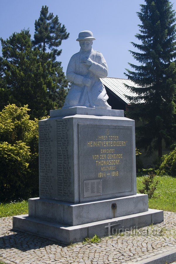 Přímo u budovu obecního úřadu v Domašově, což je dnes centrum spojených obcí, označených souhrnně Bělá pod Pradědem najdeme pomník obětem první světové války, nebo jak se tehdy říkalo Velké války. Když pomník odhalovali, doufalo se že žádná další podobná válka už nebude. Dnes už víme, že domněnky to byly mylné. Nakonec do dokazuje táhlý soupis v podstatě samých německých jmen na čelní a zadní…