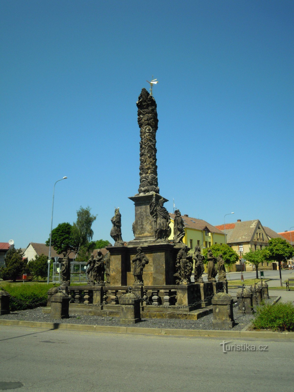 barokní sloup Nejsvětější Trojice na návsi.