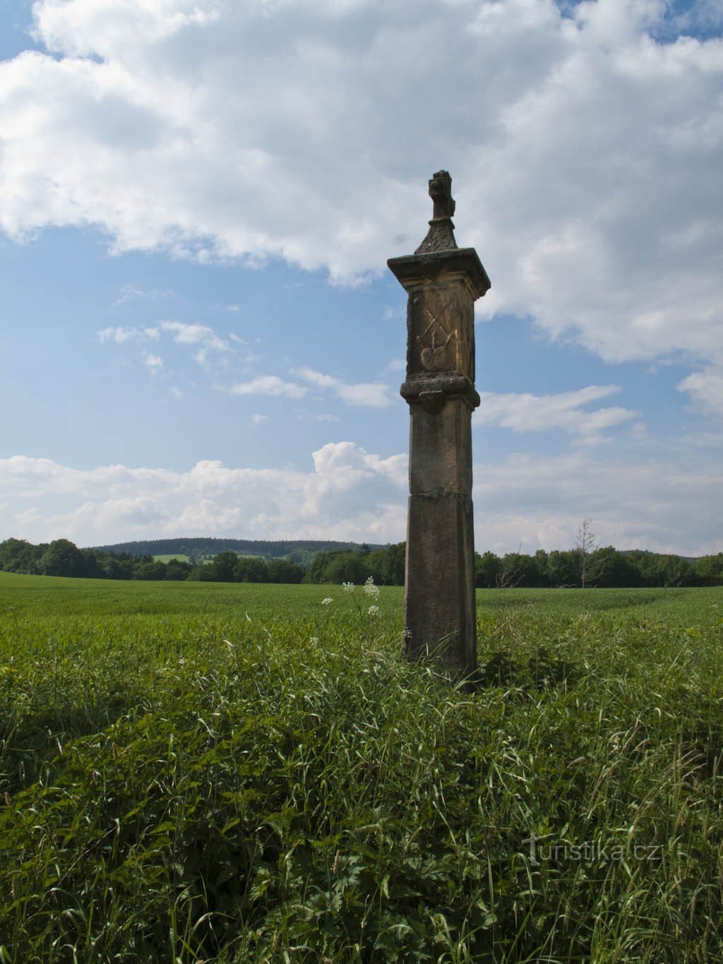 Strana obrácená k silnici je vyzdobena reliéfem Malé Kalvárie – tj. Kristem na kříži s Marií sv. Janem Evangelistou. Strana obrácená ke…