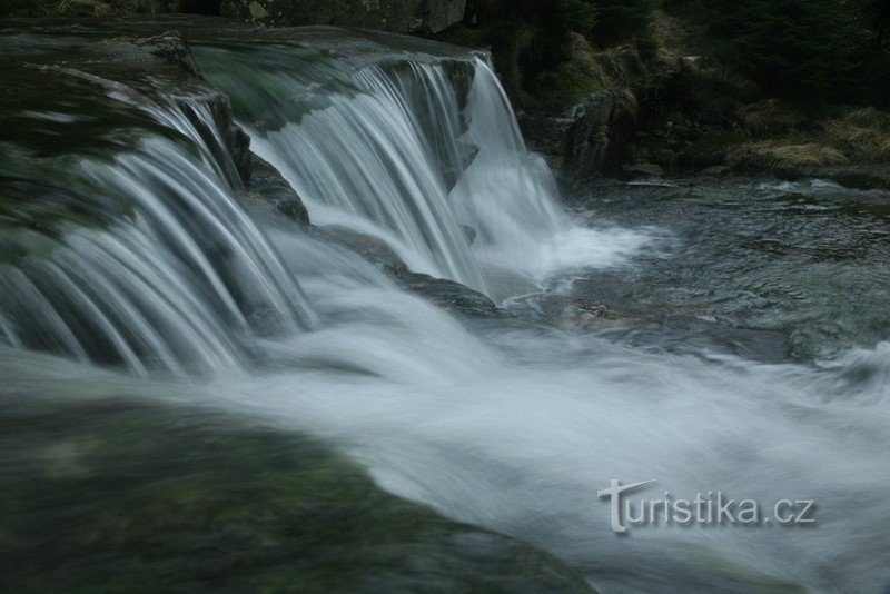 Krásný vodopád na Čertově strouze. Není sice moc vysoký (cca 2 m), ale díky velkému průtoku tak vypadá mohutně. K vodopádu je možno se dostat po pěšině vedoucí od žluté značky (serpentina) pokračováním proti proudu potoka cca 250 m.