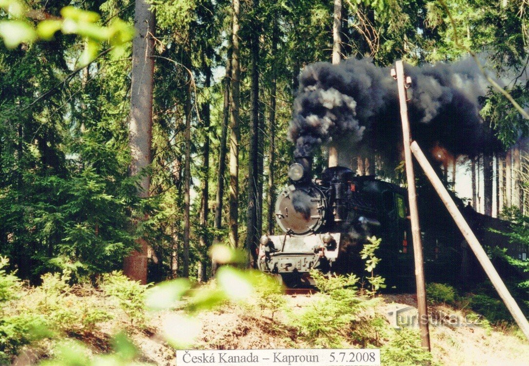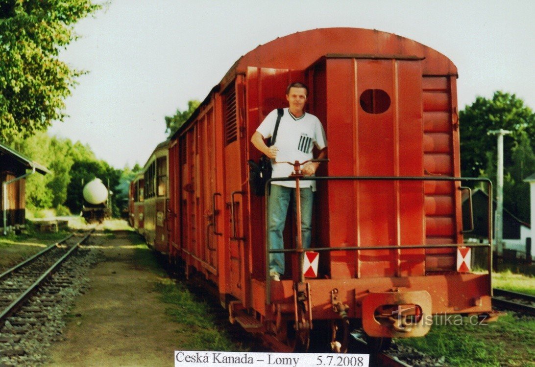 O prázdninách r.2008 jsme se rozhodli vyrazit na dvoudenní výlet a projet se známou jihočeskou Jindřichohradeckou úzkokolejkou a přitom se trochu projít Českou Kanadou. Auto necháváme stát na parkovišti u nádraží v Lomech u Kunžaku. Zakupujeme jízdenky a čekání na odjezd si krátíme prohlídkou dýmající unikátní parní lokomotivy. Nastává kýžený čas odjezdu. Lokomotiva zahouká a už se s funěním…