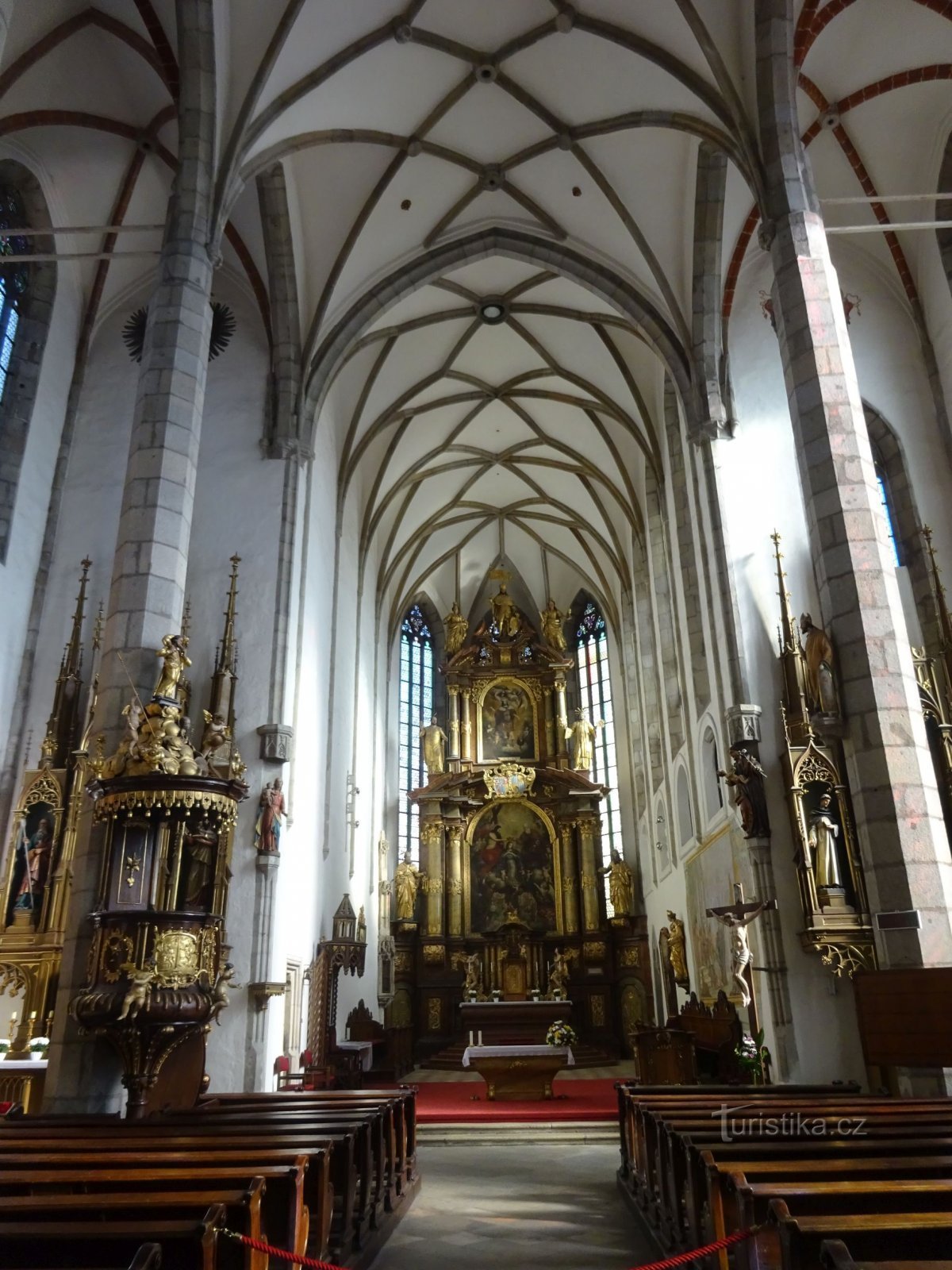 Délka kostela od západu k východu je 44 metrů, šířka a výška je přibližně stejná, 20 metrů. Trojlodí je doplněno protáhlým pětibokým presbytářem, pravoúhlou sakristií,…