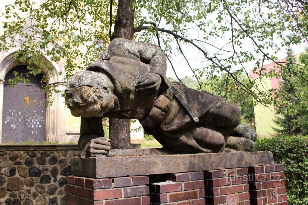 Pomník se začal stavět v roce 1935 a v následujícím roce byl dokončen a slavnostně odhalen. Nalézá se před průčelím kostela sv. Havla. Podstavcem jsou čtyři sloupy z cihel. Na nich je umístěna socha raněného vojáka, pod kterým leží puška. Je to velmi zajímavá práce, která se jen tak nevidí. Socha byla zhotovena v sochařské dílně F. Watzka v Teplicích. Nedaleko pomníku stojí železný kříž s…