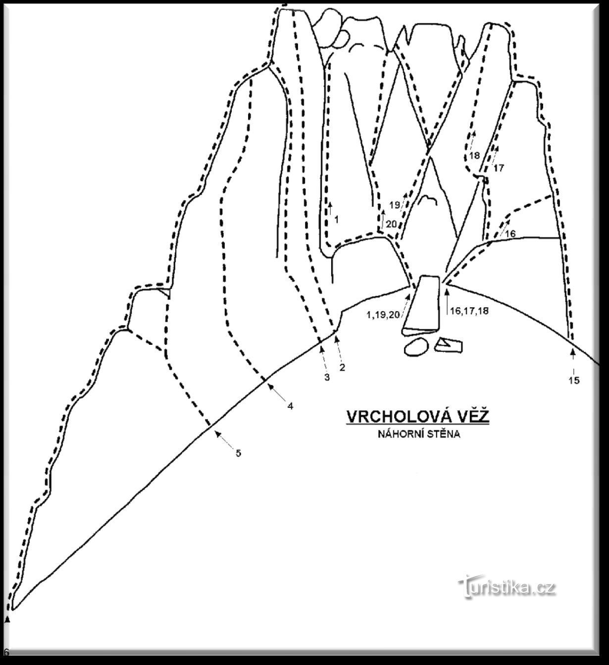 Samostatná skalní věž stojící v jižním svahu nad obcí Brná. Údolní stěna věže je mírně položená vysoká až 35 metrů. V levé části na věž navazuje položená skála (cca 8 m vysoká). Náhorní stěna věže je vysoká asi 8 metrů a převážně kolmá s několika menšími převisy. Věž je rozdělena několika vertikálními spárami, kterými vedou nejhezčí cesty. Převažuje lezení plotnového charakteru po lištách a…