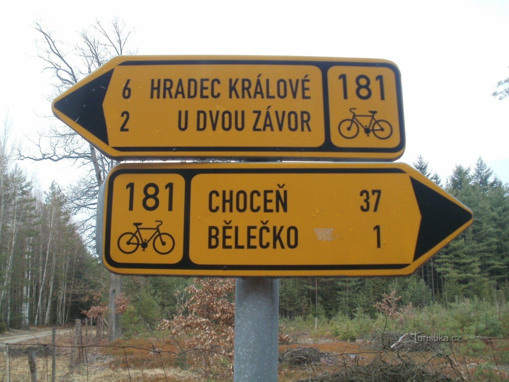 Cykloturistický rozcestník, který se nachází cca v polovině cesty na lesní komunikaci Hradečnice mezi Hradcem Králové Malšovicemi a Bělečkem, ukazuje cyklistům po trase č. 181 ve směru Hradec Králové - Choceň