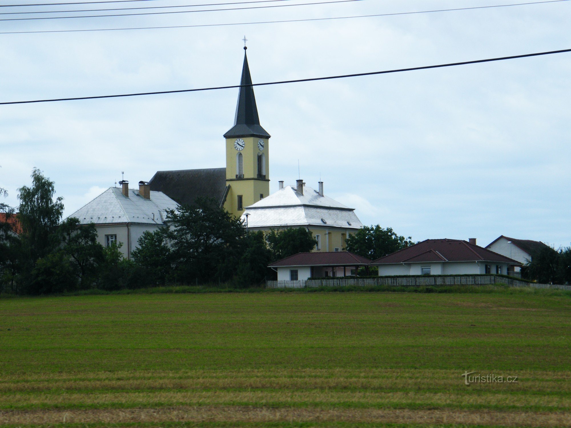 V obci žije asi 450 obyvatel, Kostel svatého Jana Křtitele.