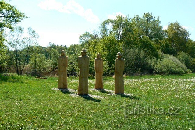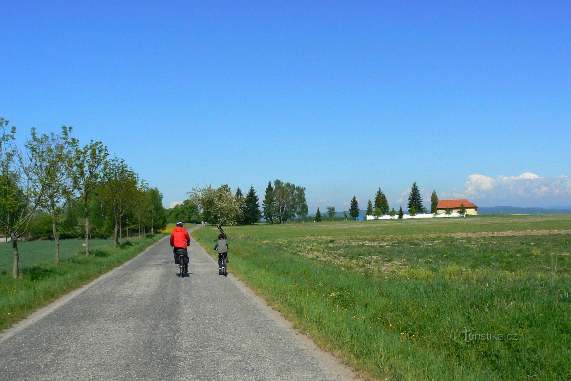 Autem jsme dojeli do Drahonic, které leží asi 15 km za Pískem, kde jsme zaparkovali na návsi poblíž obecního úřadu a odtud už vyrážíme na kole.