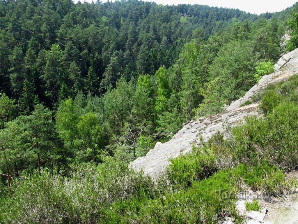 Vracíme se k rozcestí Velká Řebčice a pokračujeme po červené k Martinské stěně. Asi po 3km lesní cestou bohudík ve stínu stromů se odpojuje cyklo 0058 a po chvíli přicházíme ke strmé Martinské stěně, prudce spadající do Komářího dolu. Přecházíme po úzké ochozové pěšince a sluníčko pálí jako by pec otevřel. Ze srázu se plazí suché,…