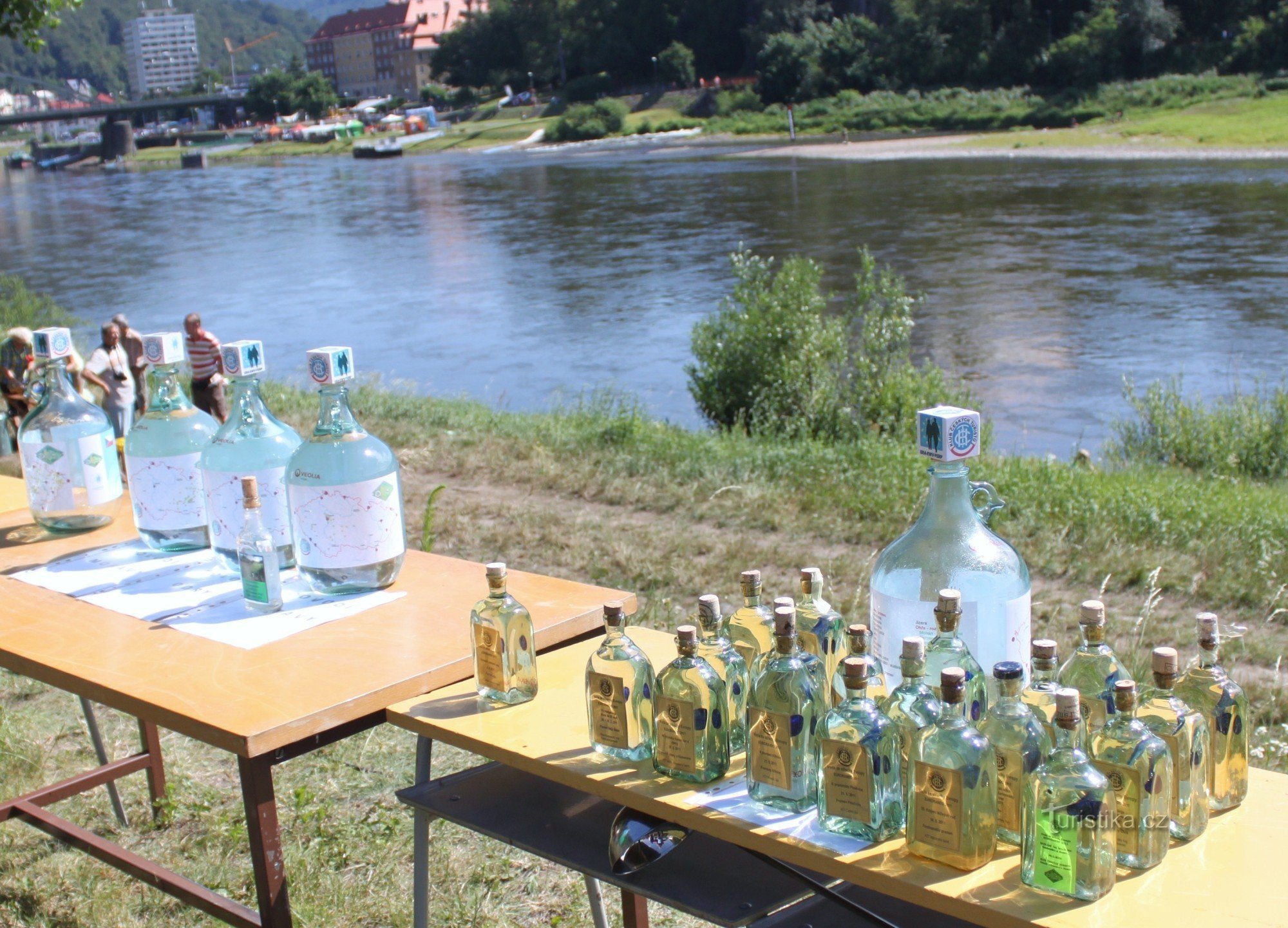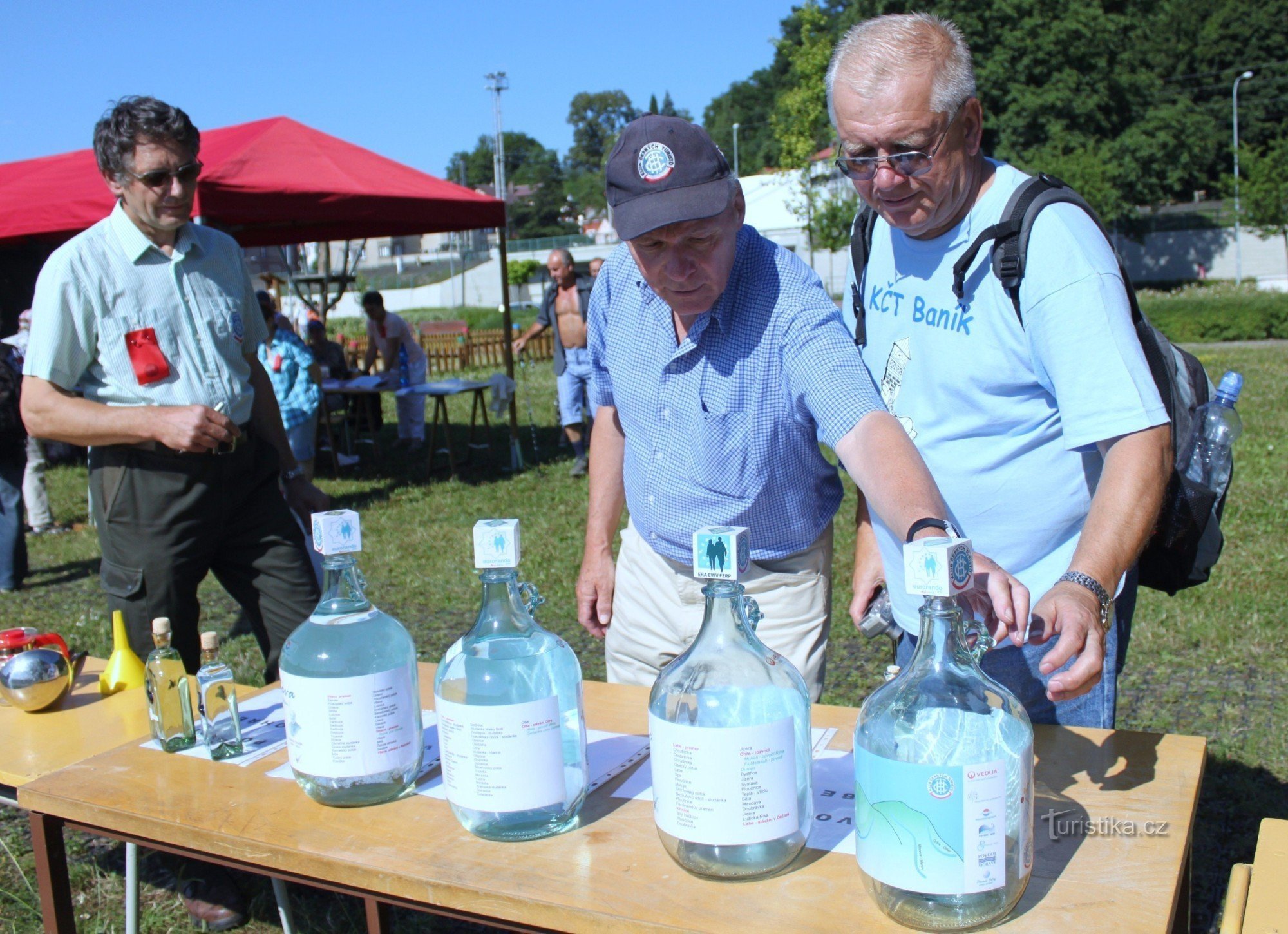 EURORANDO - slévání vod z povodí v ČR. 9.7.2011 byly na břeh Labe přineseny vody od pramenů, doplněny vodou z Labe a slity do připravené nádoby pro cestu do Španělska. Počasí přálo a vodnická rodinka spolu se souborem Lužičan byla připravena. Podle známého přání Jamese Bonda - "Protřepat, nemíchat" se tak stalo a voda je připravena. Den se vydařil.