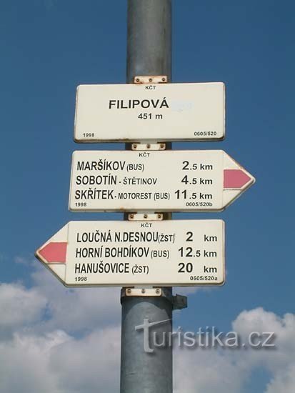 Rozcestí červené turistické značky. Nachází se v železniční zastávce Filipová, asi 3 kilometry jižně od vesnice Loučná nad Desnou.