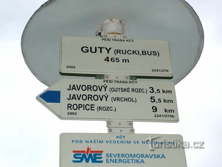 Rozcestí Guty ( Rucki ) je výchozím bodem modré turistické značky. Po této značce se vydáme jižním směrem přes Oldřichovický les proti toku Javorového potoka a přes rozcestí Gutské sedlo - Javorový k turistické chatě Javorový vrch. Od této chaty můžeme dále pokračovat na vrchol Javorový ( 1031 m.n.m.). Rozcestník stojí v sousedství autobusové zastávky. Naproti rozcestníku je Gutská hospoda s…