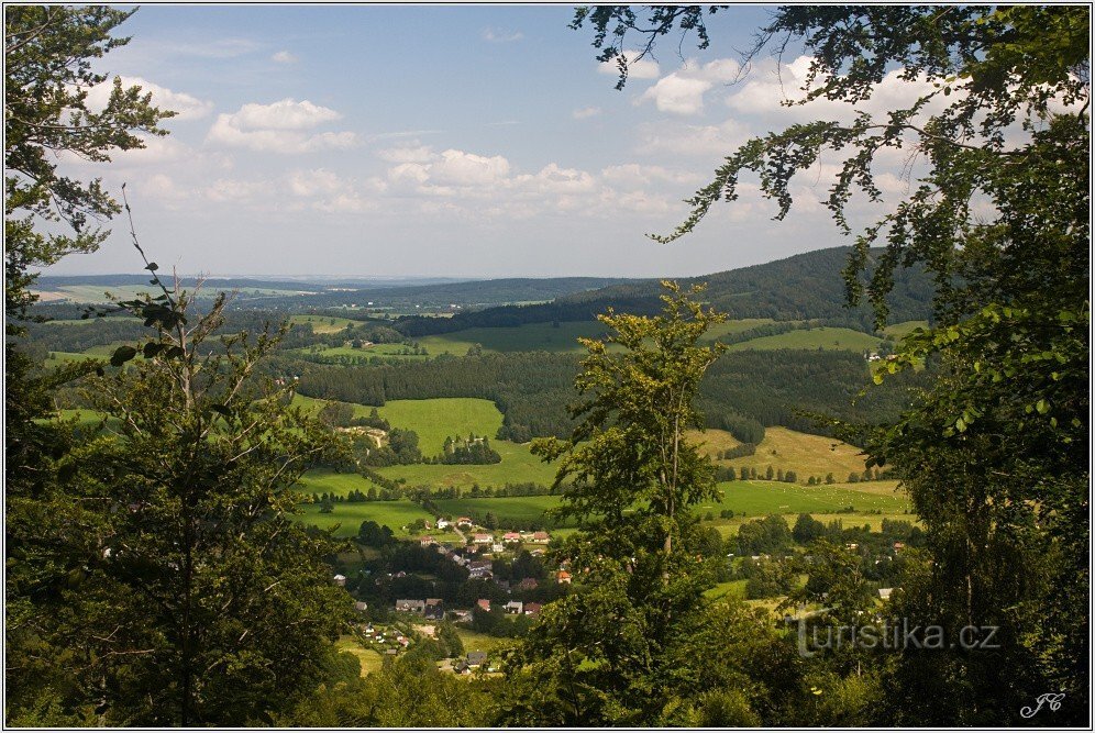 Trasu začneme v Hejnicích po červené značce směrem na Ořešník. Převážná část úseku vede lesem a jedná se o dost náročné stoupání (převýšení 500 m). Naštěstí si ho občas můžeme zpestřit výhledy (foto 1 - 3). Červená nás dovede pod Zahradní věž, kde začíná krátká odbočka na vrchol Ořešníku (foto 4, 10). Jeho skalnatý vrchol je přístupný po žebřících (foto 5, 9) a výhled z něho je impozantní (foto 6…
