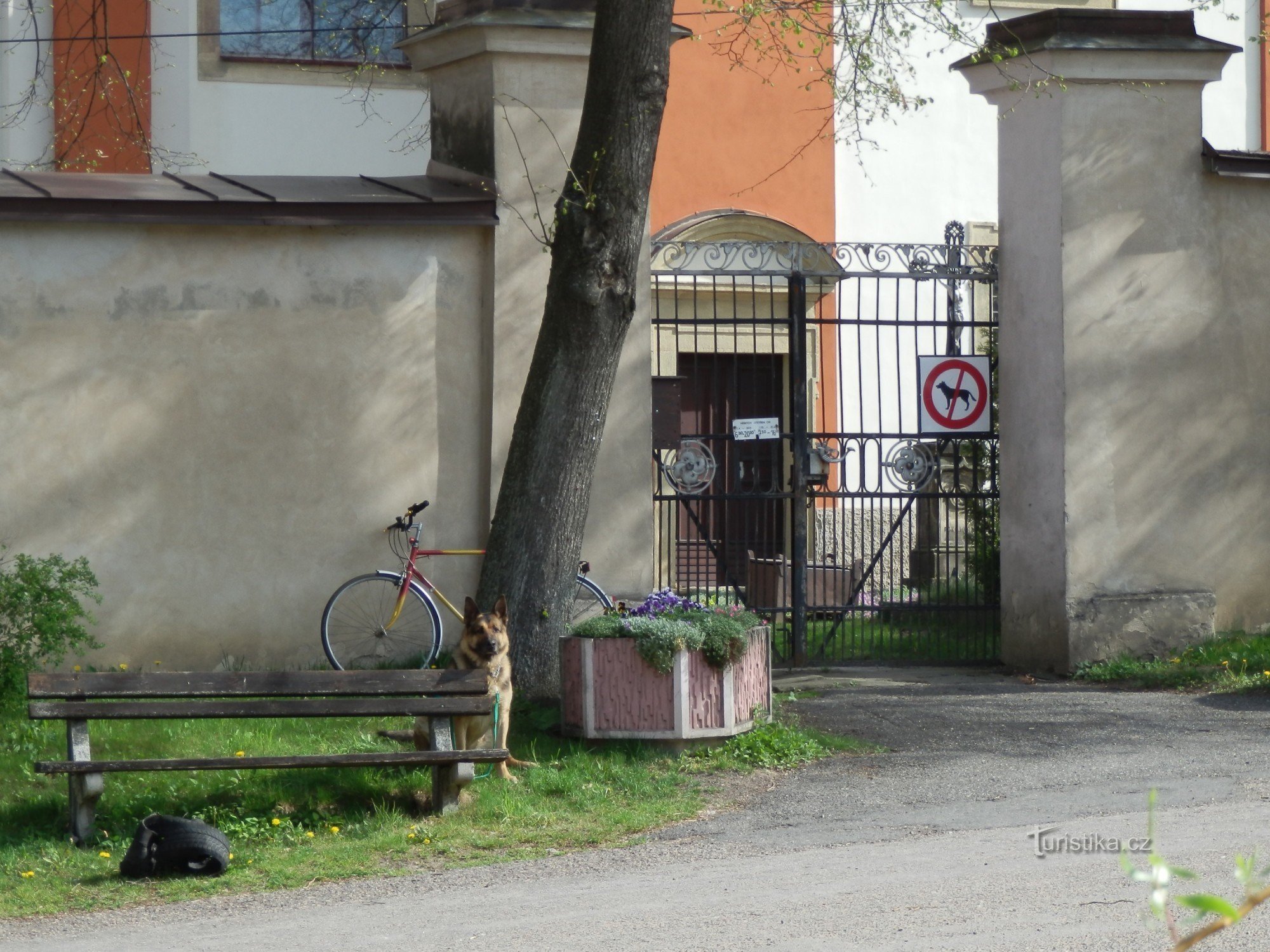 Kolem kostela se rozkládá hřbitov, obehnaný eliptickou hřbitovní zdí z…