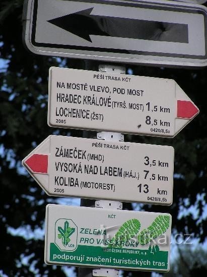 Rozcestí a orientační místo na turistické trasa nedaleko Fakultní nemocnice.