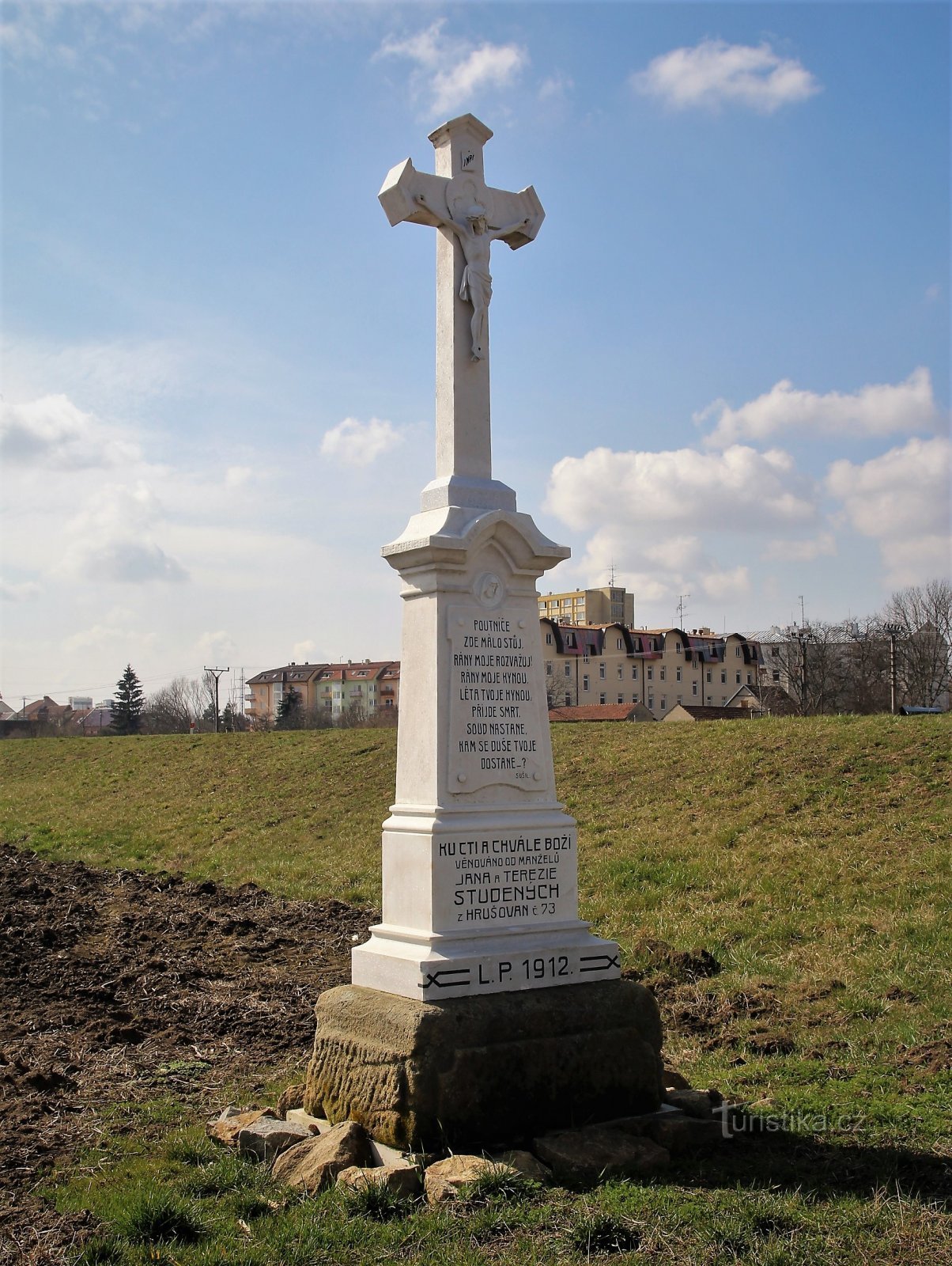 Nejkratší spojnice mezi hrušovanským nádražím a náměstím v Židlochovicích vedla vždy polní cestou směřující za hrušovanským Obecním rybníkem od říčky Šatavy k rohu Zámeckého parku. U cesty v poli stával od roku 1912 kamenný kříž, který zde svým nákladem nechla postavit rodina Studených z Hrušovan. Asi po vybudování silničního obchvatu, který slouží i jako protipovodňová hráz, došlo k posunu této…
