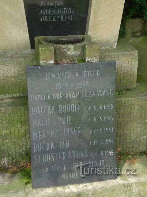 památník padlým ve 2.světové válce je socha vojáka sedícího na podstavci. Jsou na něm umístěny dvě desky se jmény. Na první ,horní desce, je celkem patnáct jmen a druhá, spodní deska ,nese nápis " Těm kteří v letech 1939 - 1945 padli a obětovali se za vlast a těm, kteří se dosud nevrátili" a pět jmen.