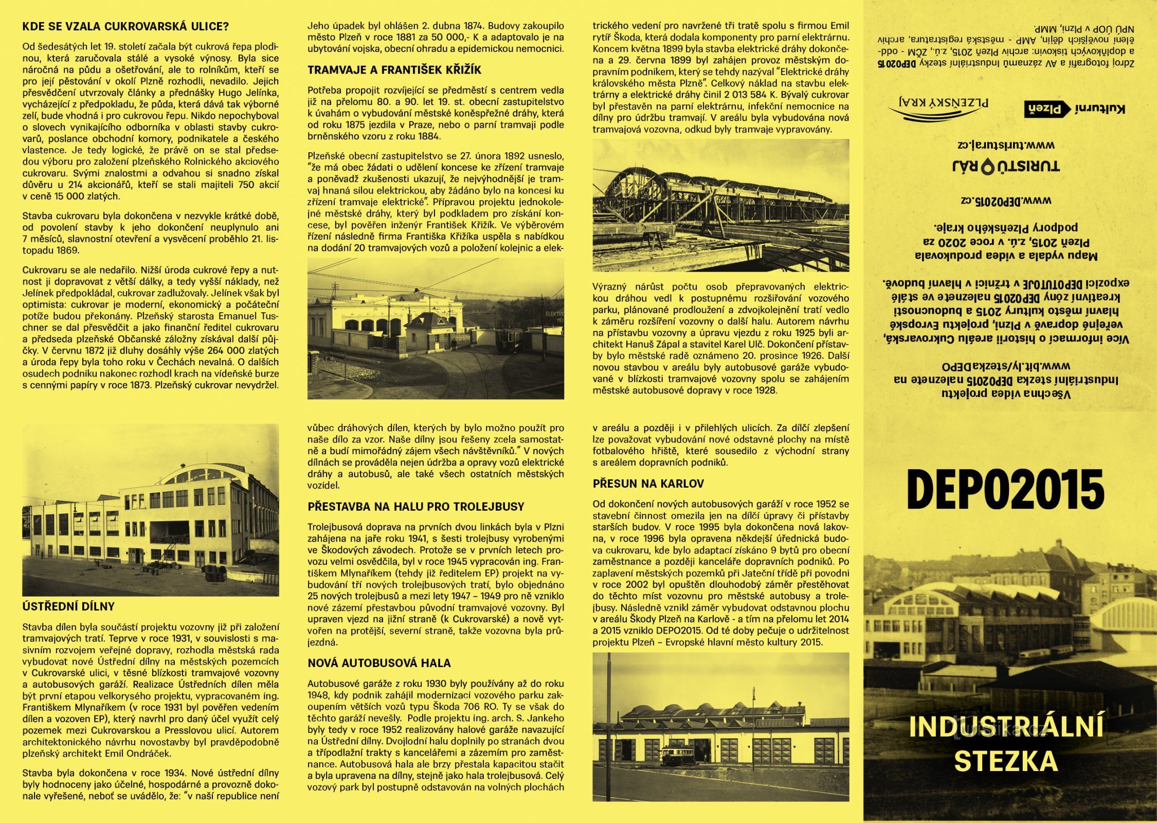 Vydejte se po stopách historie areálu DEPO2015! Industriální stezka poutavě a v souvislostech přibližuje architekturu, významné podniky a události areálu DEPO2015. Průvodcem vám bude například cukrovarnický odborník Hugo Jelínek, strojní inženýr Smola nebo třeba slavný průmyslník a vynálezce František Křižík. Z historie: