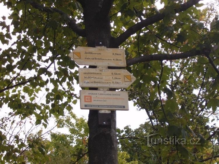 Rozcestí Naučné stezky Záviliší,na úpatí opevnění(šancí) v Jakubčovicích, nedaleko rozhledny.