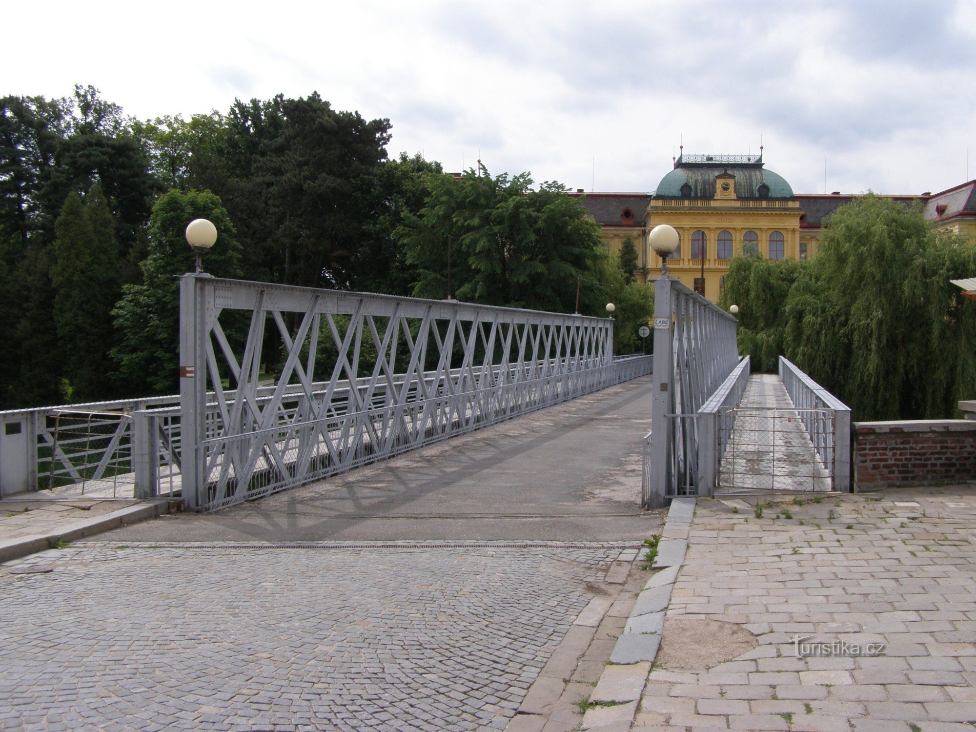 Železný most přes Labe, který spojuje centrum města s částí zvanou Na ostrově, byl dle štítku zhotoven v roce 1884. Boční lávka byla věnována veřejnosti Občanskou záložnou v roce 1931. Dnes most slouží pouze pěším a cyklistům. Přes most je vedena červená turistická značka ve směru Kuks - Jaroměř - Hradec Králové.