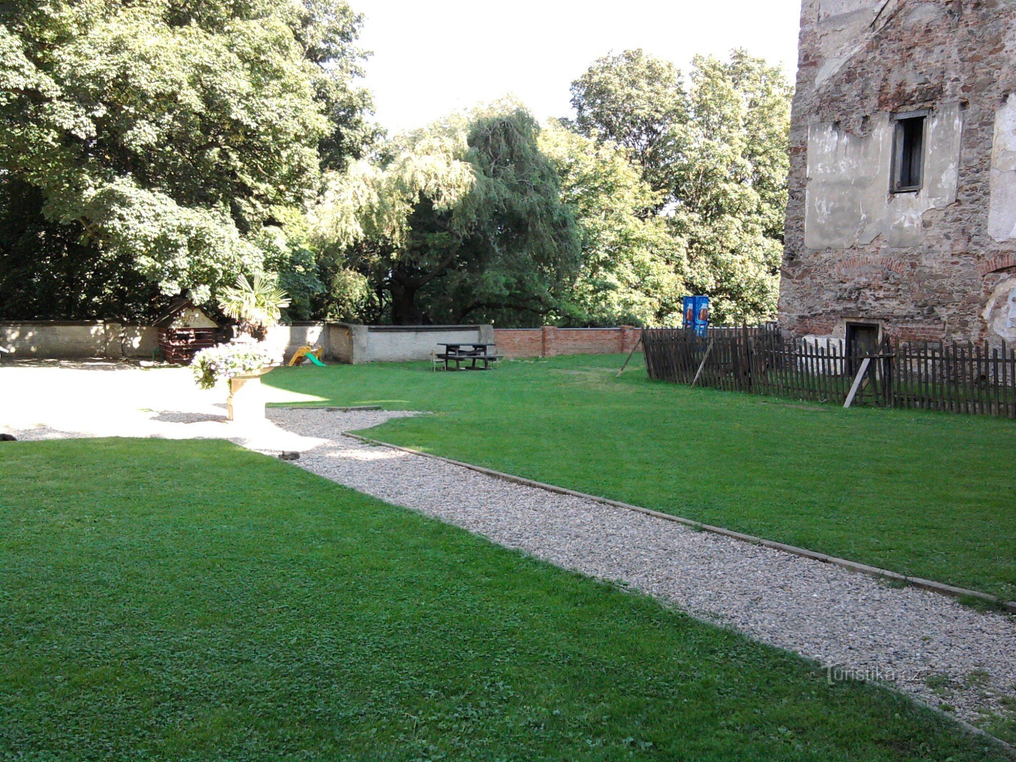 V létě se po nádvoří prochází koťata, kachničky, ve stáji mají koně.
