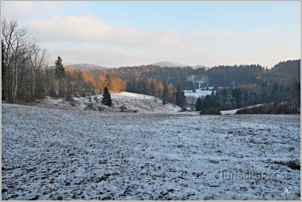 Letošní zima přála spíše pěším turistům než běžkařům a my jsme toho jaksepatří využívali. Tak se stalo, že jsme se na konci ledna ocitli v Novém Jimramově v penzionu U Fialů a strávili v okolí snad jediný hodně mrazivý (kolem -10°C) a přitom slunečný víkend. Turisticky značených tras tady mnoho není, ta popisovaná mě už ale lákala hodně dlouho. Nezklamala.