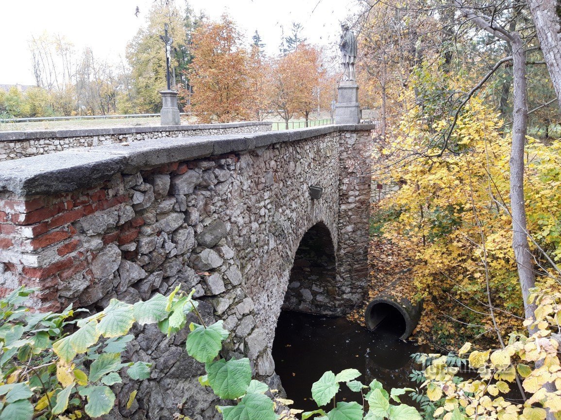 Na okraji Milevska, v blízkosti klášterního areálu a hřbitova teče Milevský potok. A přes něj postavili v polovině 19. století dvou obloukový kamenný most. Tento starobylý krasavec je zdobený nad svým středním pilířem litinovým křížem a plastikou, sochou sv. Jana Nepomuckého. Skulptura tohoto světce je datována asi do roku 1778 a dříve stávala patrně před branou do kláštera.