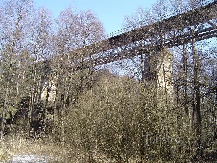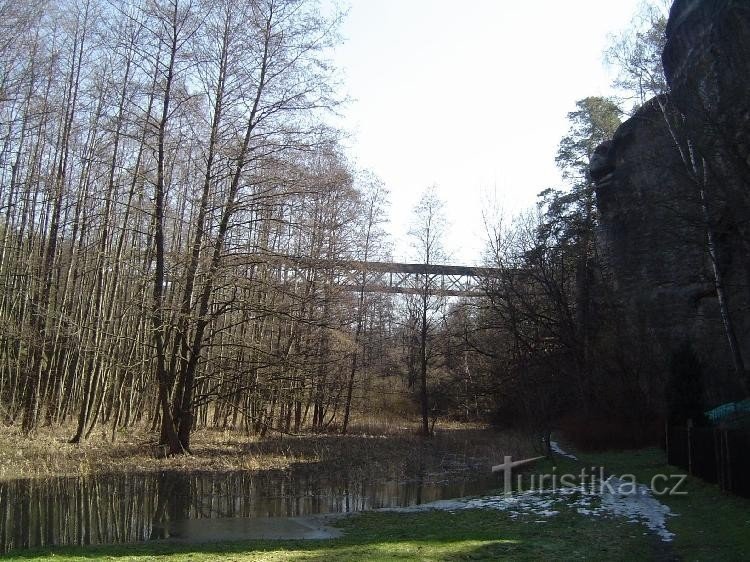 Osada při vstupu do údolí Pekla u Zahrádek. Rázovité roubené stavby vrostlé do pískovcových skal. železniční viadukt z roku 1897.