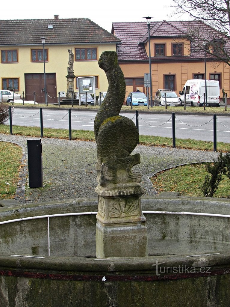 Nachází se na náměstí v horním parčíku před budovou radnice. Tvoří ji bazén tvaru kruhu, z jehož středu trčí hranolový sloup, na němž je umístěn chrlič ve formě ryby.