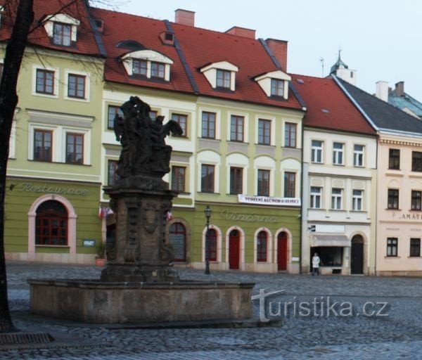 Pískovcová Kašna pochází z roku 1772. Barokní sousoší sv.Jana Nepomuckého se 2 velkými anděly je z dílny Matyáše Brauna a vzniklo již roku 1718 nákladem císařského rychtáře Jana Fridricha. Sousoší původně stálo před dnes již neexistující Pražskou branou.