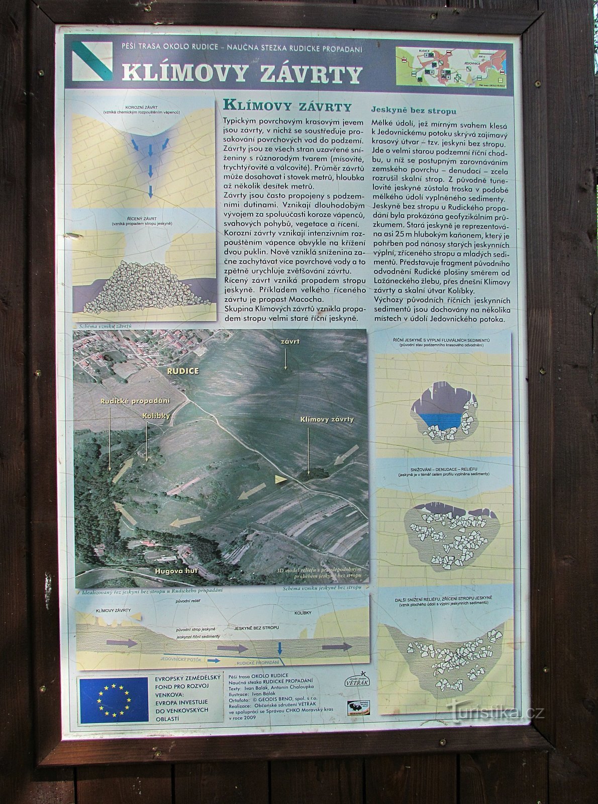 Přibližně na polovině Naučné stezky Jedovnické rybníky-Rudické propadání mezi jedovnickým náměstím a obcí Rudice (Pozor – trasa není v terénu značena!) narazíme u polní cesty na informační ceduli, upozorňující nás na výskyt tzv.Klímových závrtů. Co jsou tyhle prohlubně vyskytující se v krasovém terénu zač... a že se pod nimi nacházejí vstupy do jeskyní ví dnes už každé školou povinné dítě. …