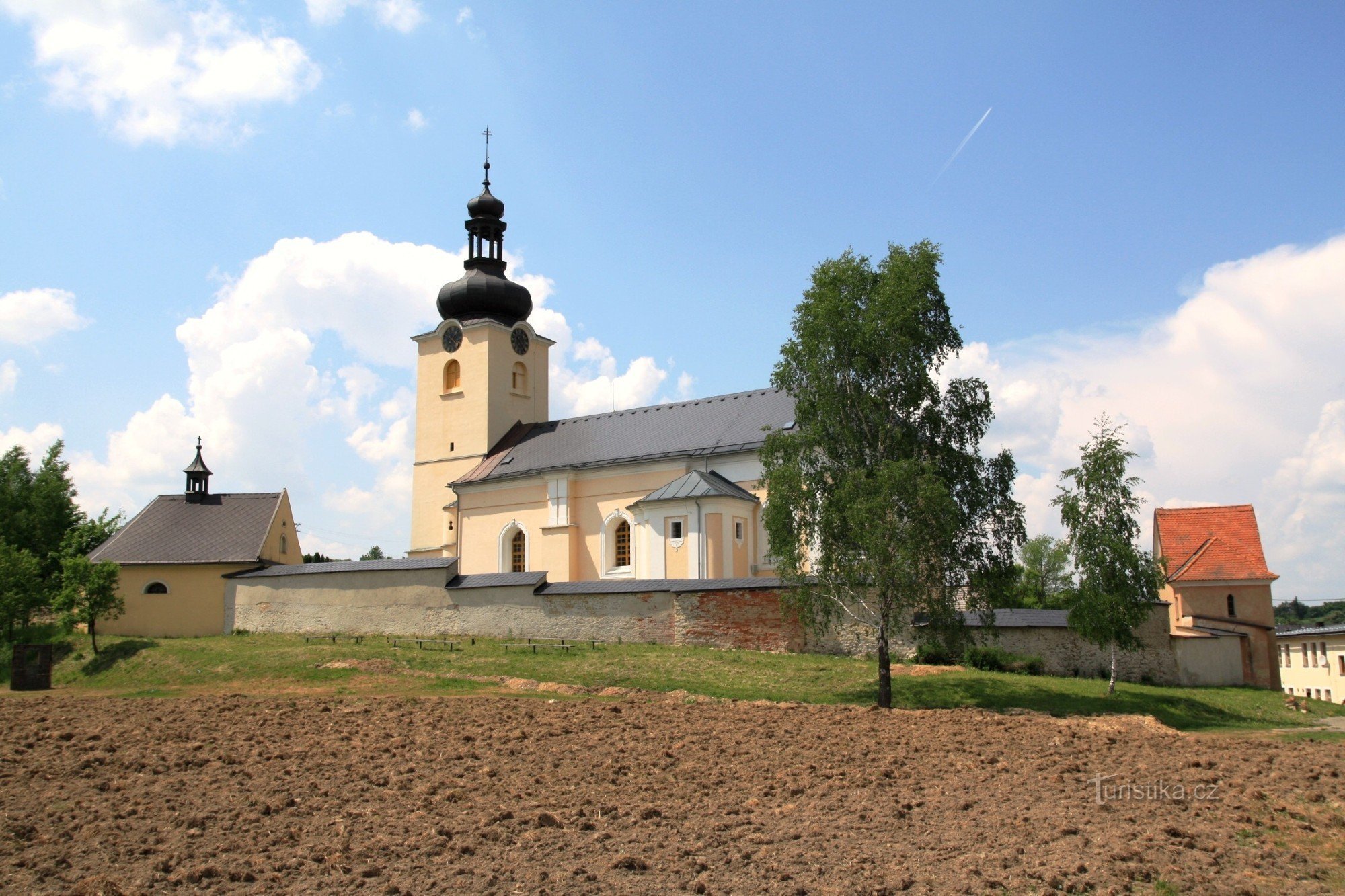Nachází se ve svahu uprostřed protáhlé vsi. Je obklopen hřbitovní zdí s výklenky, kaplemi a bránou s bývalým obydlím poustevníka. Byl vystavěn v barokním slohu v roce 1771. Ve výklencích hřbitovní zdi kamenné reliéfy Křížové cesty z roku 1856.