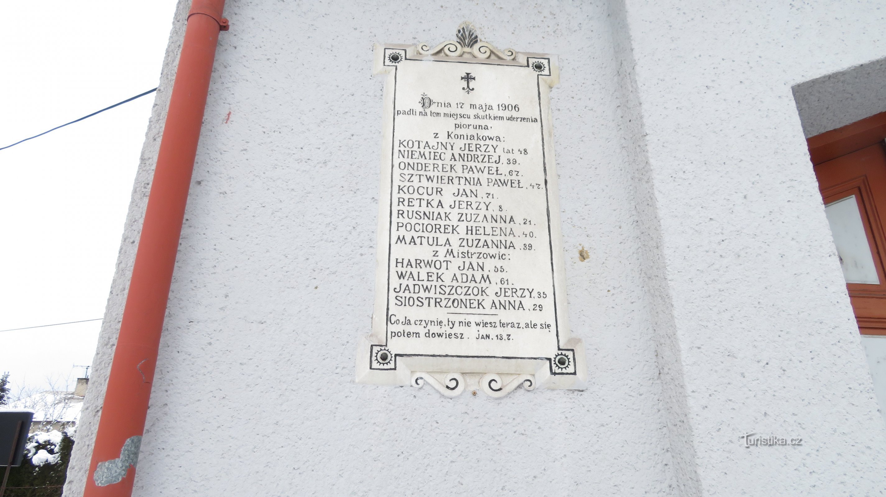 Dne 17. května 1906 při pohřbu rolníka Michala Farného se schýlovalo k bouři a začal prudký liják. Celý pohřební průvod se nahrnul do kaple u hřbitova v Koňakově u Českého Těšína. Věž kaple neměla hromosvod a do zástupu udeřil kulový blesk. Třináct lidí zabil na místě, řadu zranil, většinu omráčil.Na kapli jsou umístěny dvě pamětní desky. Překlad z pamětní desky : " Co já činím, nemůžeš vědět,…