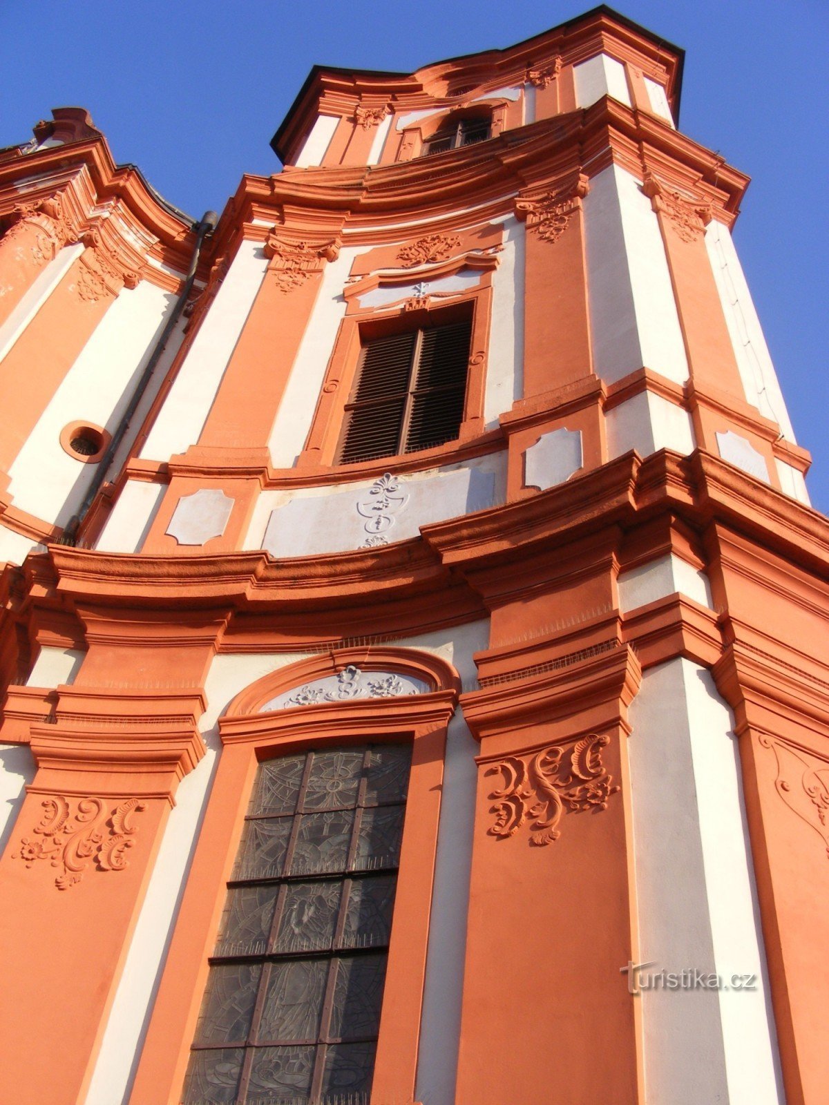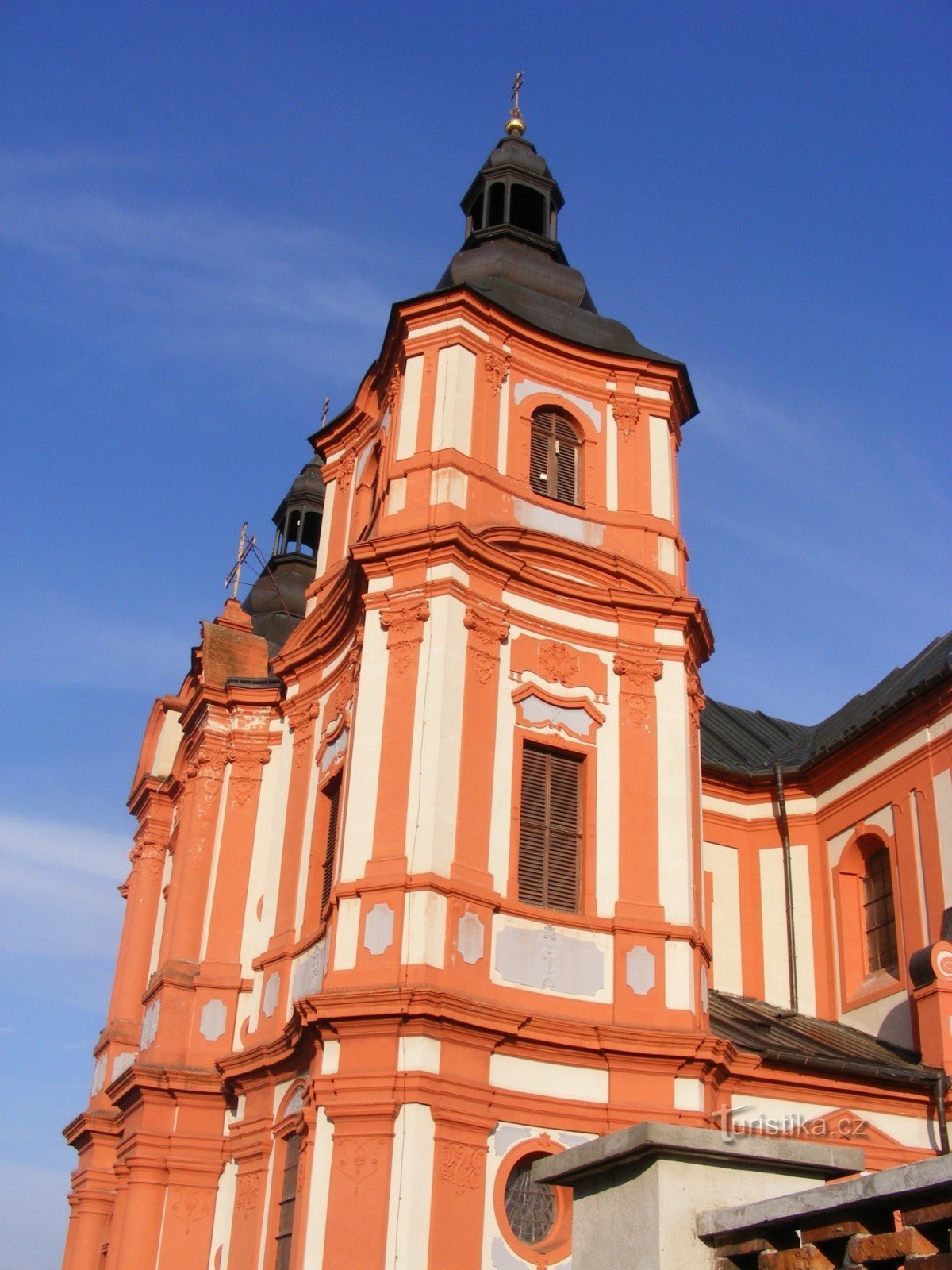 Barokní kostel stojící po levé straně hlavní silnice z Plzně na Klatovy.
