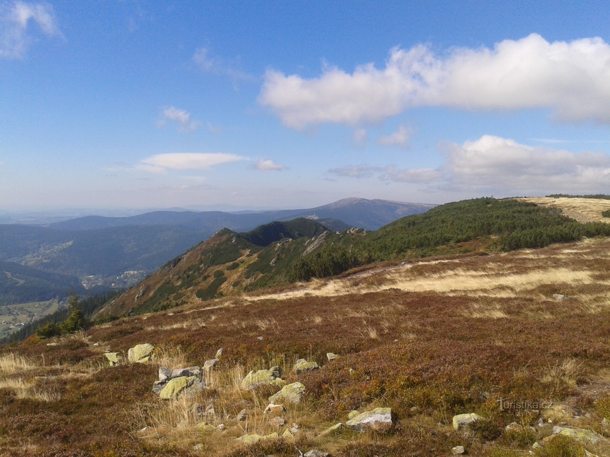 Krásné panorama Kozích hřbetů, pod kterými leží Špindlerův Mlýn.V dáli je vidět Labský důl, Labská bouda, Sněžné jámy a Vysoké kolo.Na druhé straně majestátně stojí nejvyšší hora ČR Sněžka.