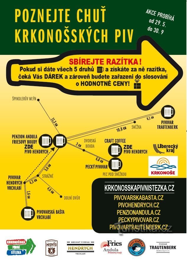 Krkonošská pivní stezka vás provede po jedinečných minipivovarech, které vaří pivo z tradičních surovin a pramenité horské vody v nejvyšších českých horách. Milovníci horské turistiky a piva mají možnost tyto dva koníčky propojit a od 29.5. do 30.9. 2021 navštívit krkonošské pivovary, tím získat báječný zážitek a také pěkné ceny.