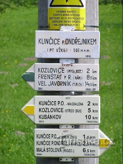 Rozcestí Kunčice pod Ondřejníkem je křižovatkou žluté a zelené turistické trasy a nachází se v severní části obce. Nedaleko rozcestí stojí parkhotel Horizont a v jeho okolí je chatová osada. Severovýchodním směrem se nad rozcestím zvedá vrchol Skalka ( 964 m.n.m.). Po žluté značce se vydáme ze železniční stanice v Kunčicích a přes rozcestí dále pokračujeme přes obec Kozlovice do oblasti…