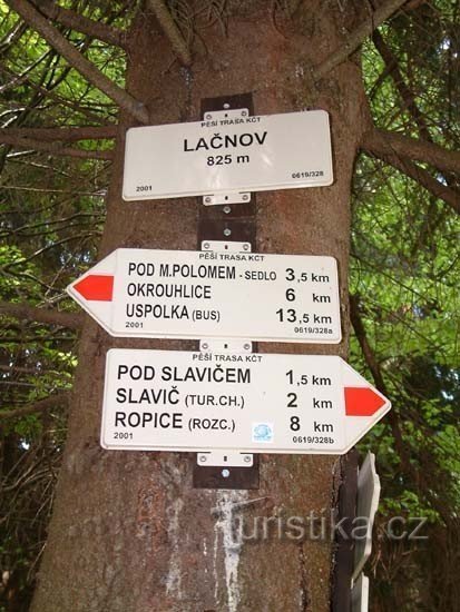 Lačnov je rozcestí červené a žluté turistické značky asi 2 kilometry západně od vesnice Horní Lomná a nedaleko severozápadního okraje horské osady Lačnov. Rozcestník je umístěn na stromě u křižovatky lesních cest a naproti němu je vybudováno zastřešené odpočinkové místo a to lavičky se stolem. Žlutá značka vede k rozcestí z obce Horní Lomná a pokračuje k vodní nádrži Morávka a podél jejího…