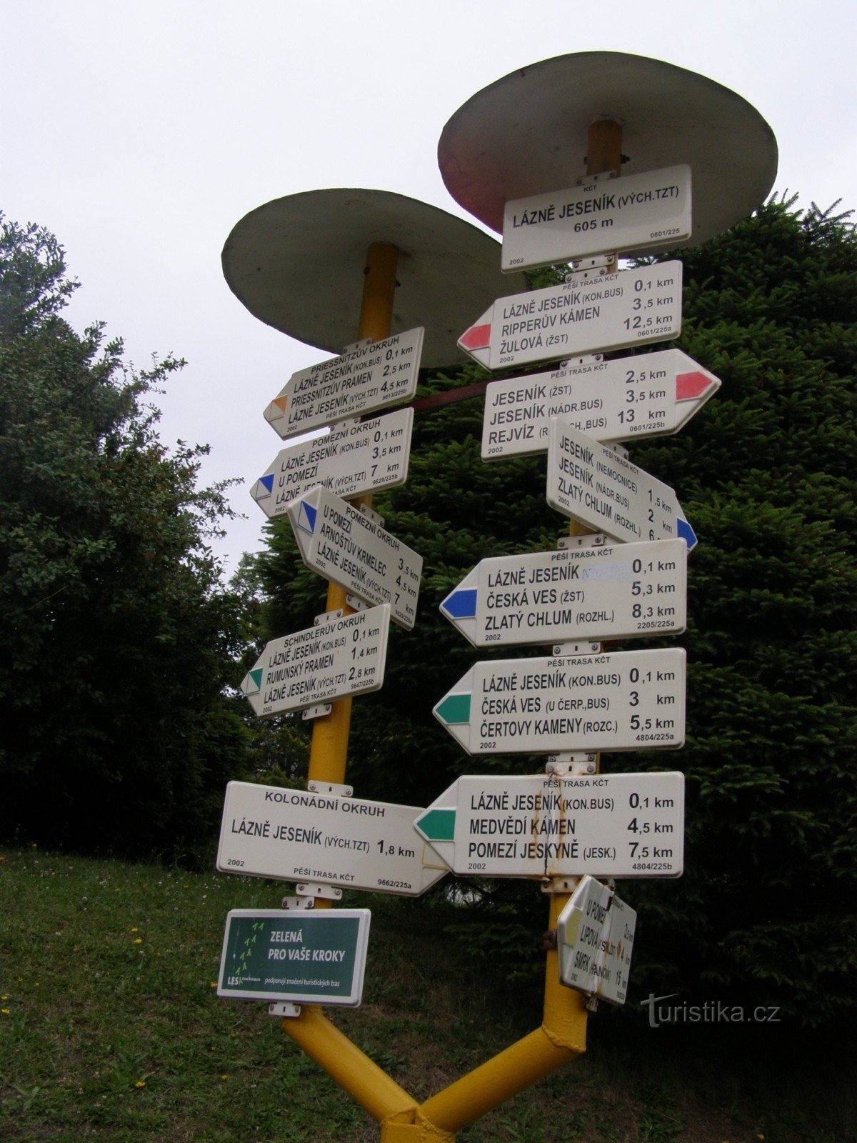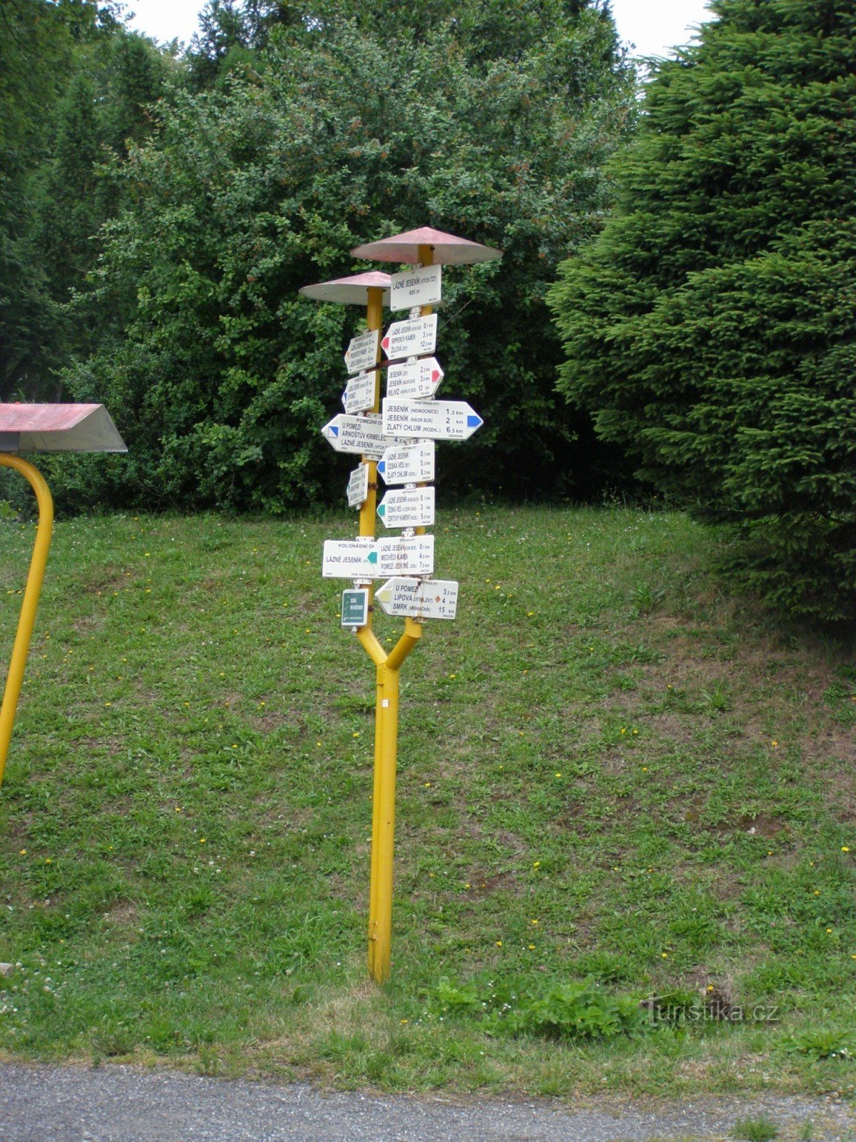 Turistický rozcestník, který se nachází u konečné zastávky autobusu v Lázních Jeseník, ukazuje turistům cestu do více směrů. Po značce červené ve směru Jeseník - Ripperův kámen, Žulová, Rychleby, Javorník, po modré značce ve směru Jeseník nemocnice - Krajník, Česká Ves a po zeleně značené NS Zlatý Chlum ve směru Lázně Jeseník - Křížový vrch. Samostatně je značen směr ke kolonádnímu okruhu. Dále…