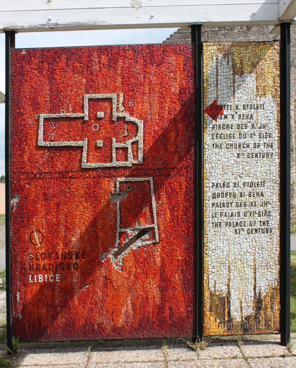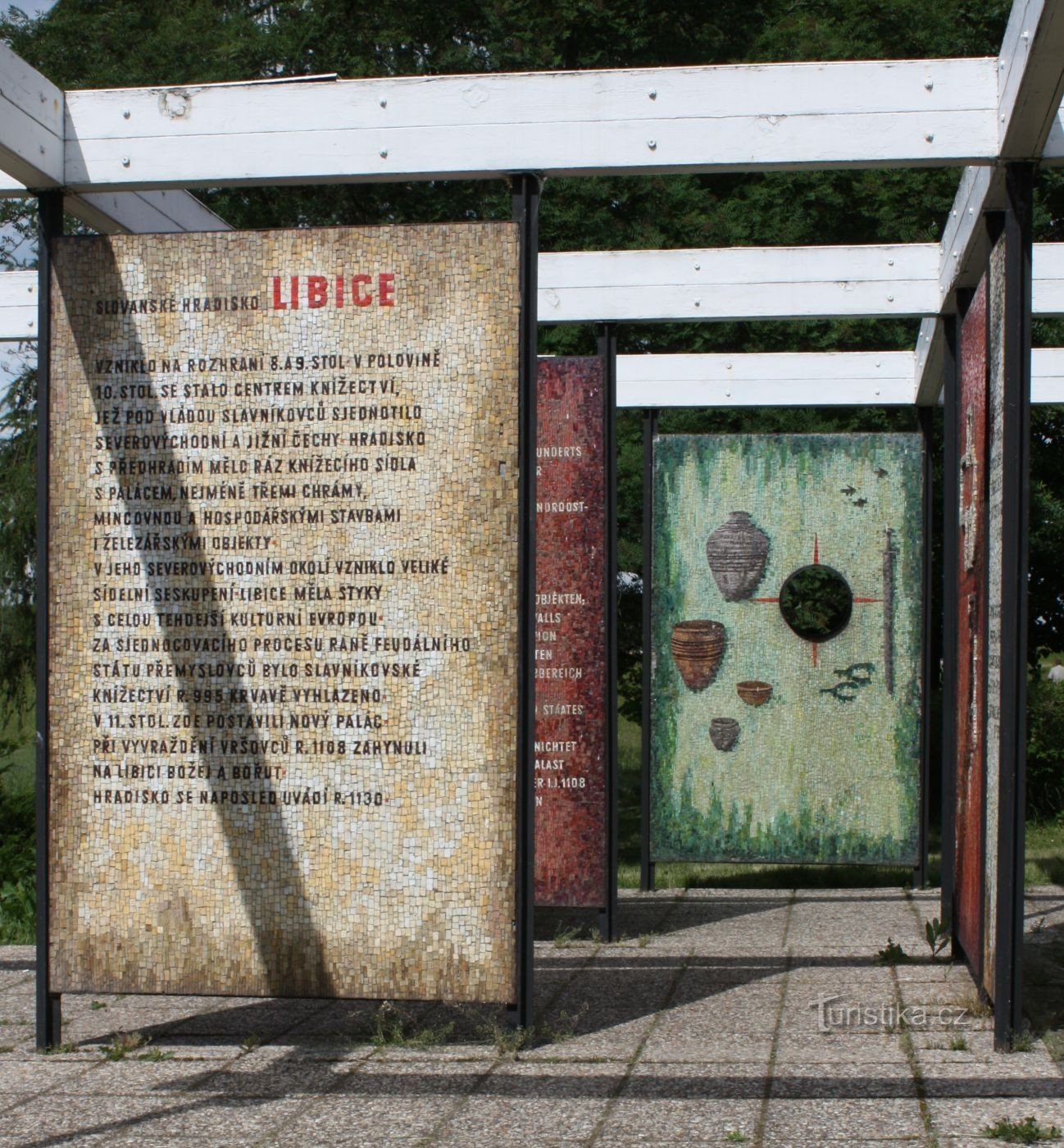 Památník byl na úpatí akropole vybudován v roce 1966. Je tvořen několika deskovými mozaikami, které zobrazují vybrané nálezy, ale také stručně shrnují historii slavníkovského Hradiště v několika světových jazycích.