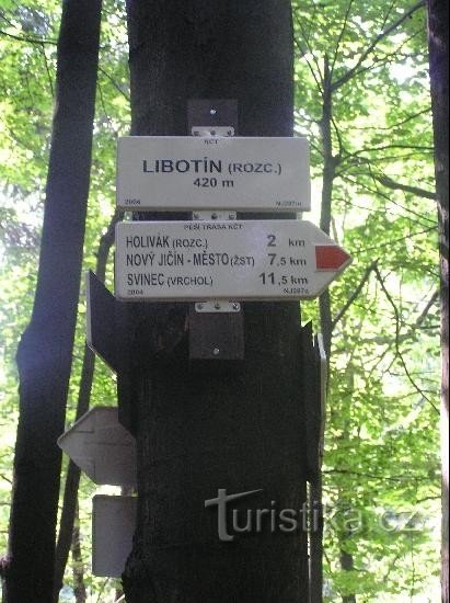 Libotín je rozcestí zelené a červené turistické značky a nachází se jihozápadním směrem od města Štramberk. Rozcestník je umístěn v oblasti lesa Libotín u křižovatky lesních cest a v sedle mezi vrcholky na severu Holivák ( 483 m.n.m.) a na jižně Jedle ( 543 m.n.m.) a Hlásnice ( 558 m.n.m.). Tato lokalita je součástí přírodního parku Podbeskydí. Zelená značka vede z rozcestí Skalka u Nového Jičína…