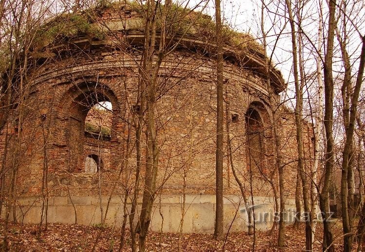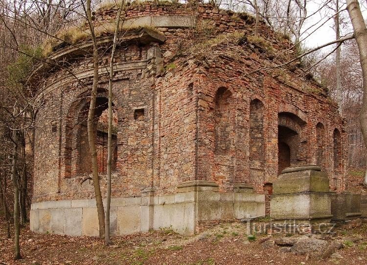 Po pravé straně silničky vedoucí od zámku Jezeří do Černic stojí v lese blízko okraje hnědouhelného dolu zbytky lobkovické hrobky, známé pod názvem Hraběcí kaple. Kdysi v těchto Místech bývala paseka, nedaleko tekl Šramnický potok a vedla tudy turistická zeleně značená cesta z Dřínova k zámku. Dnešní realita je poněkud jiná...