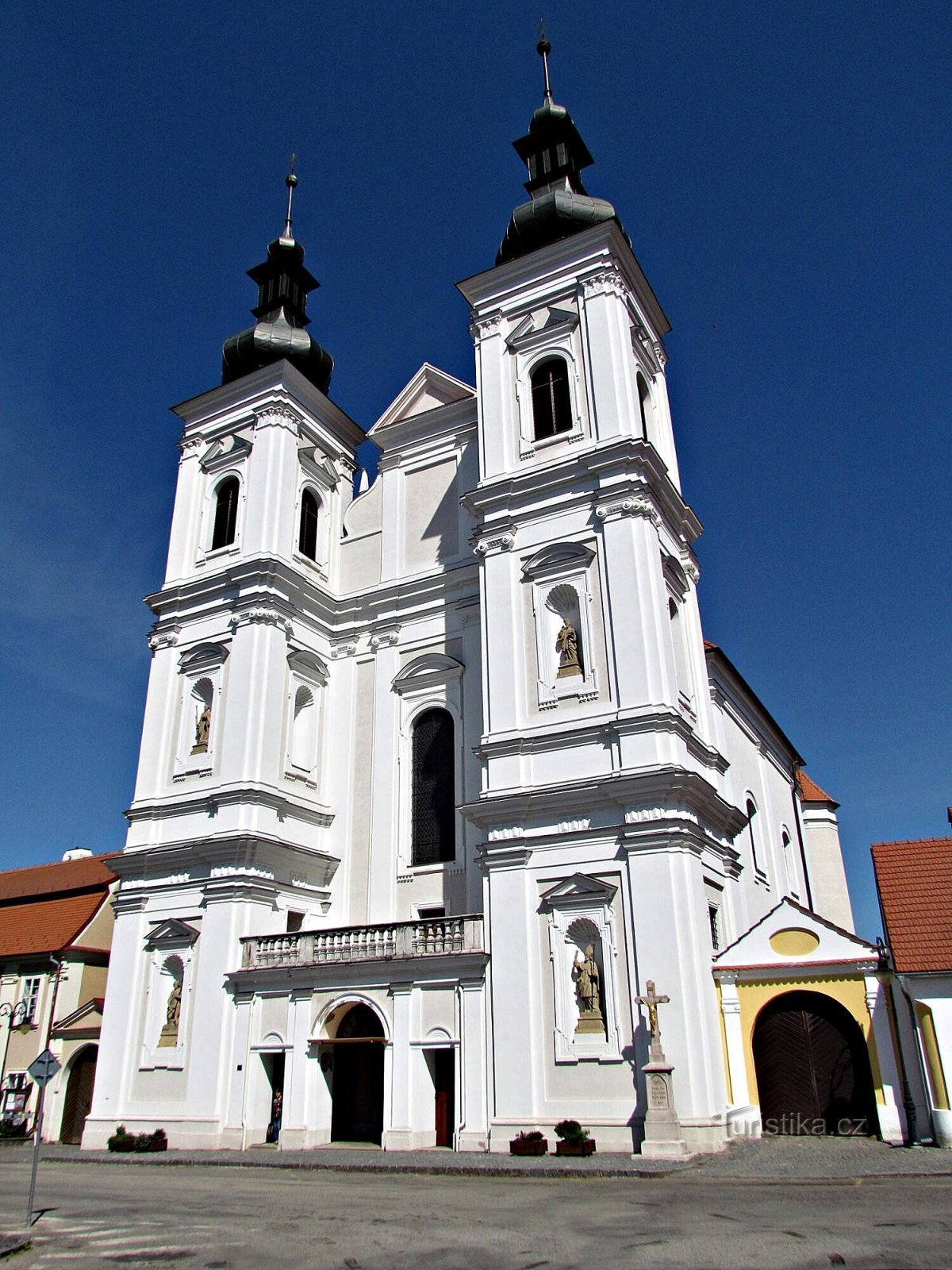 Po nečekané prohlídce obou nádvoří lomnického zámku už jsem spěchal opět dolů na rynek, abych si hledáčkem fotoaparátu podrobněji prohlédl i ty jeho úžasné památky. Všem jim dominuje bělostně zářící chrám Navštívení Panny Marie s vysokým dvouvěžovým vstupním průčelím, jediný takový na celém Tišnovsku. Cestou ke vstupu do interiéru kostela jsem minul vysokou starší paní, která tam aranžovala…