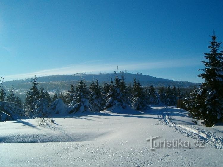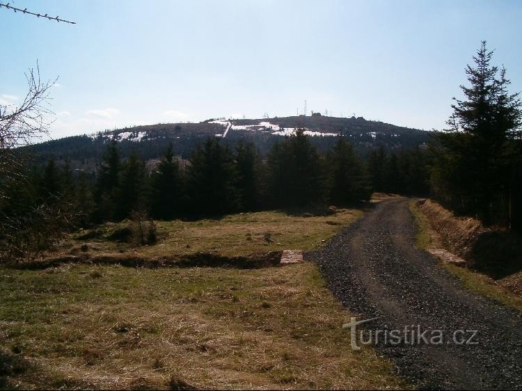 Nejvyšší bod Východního Krušnohoří, samotný vrchol nepřístupný (v oboře), ale z přilehlých skalisek daleké výhledy, na vrchol vede značená odbočka z modré trasy.