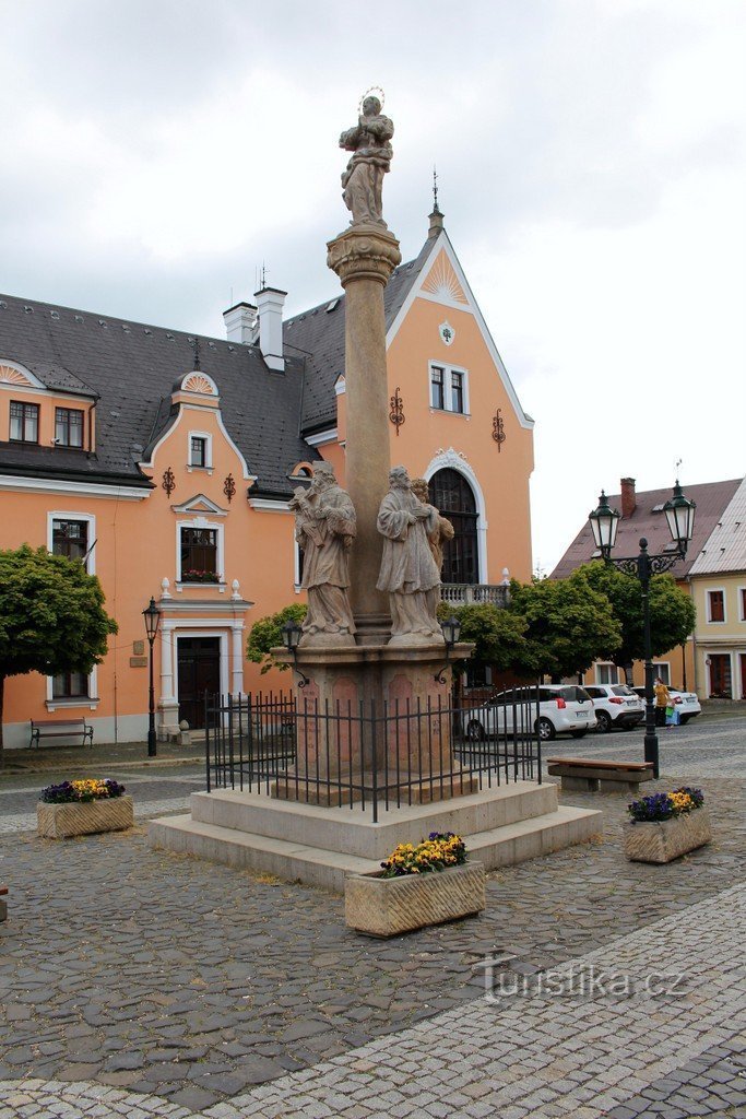 Sloup se nachází na náměstí Bedřicha Smetany. Jeho spodní část tvoří dva schodištní stupně, na kterých je položen samotný sloup. Podstavec je ve tvaru kříže a na spodní straně s nápisy a lucernami. O něco výše jsou sochy světců a to sv. Floriána, sv. Jana z Nepomuku, sv. Rocha a sv. Františka Xaverského. Nad nimi vystupuje sloup, na němž je socha Panny Marie. Kolem památky je kovový plot. Při…