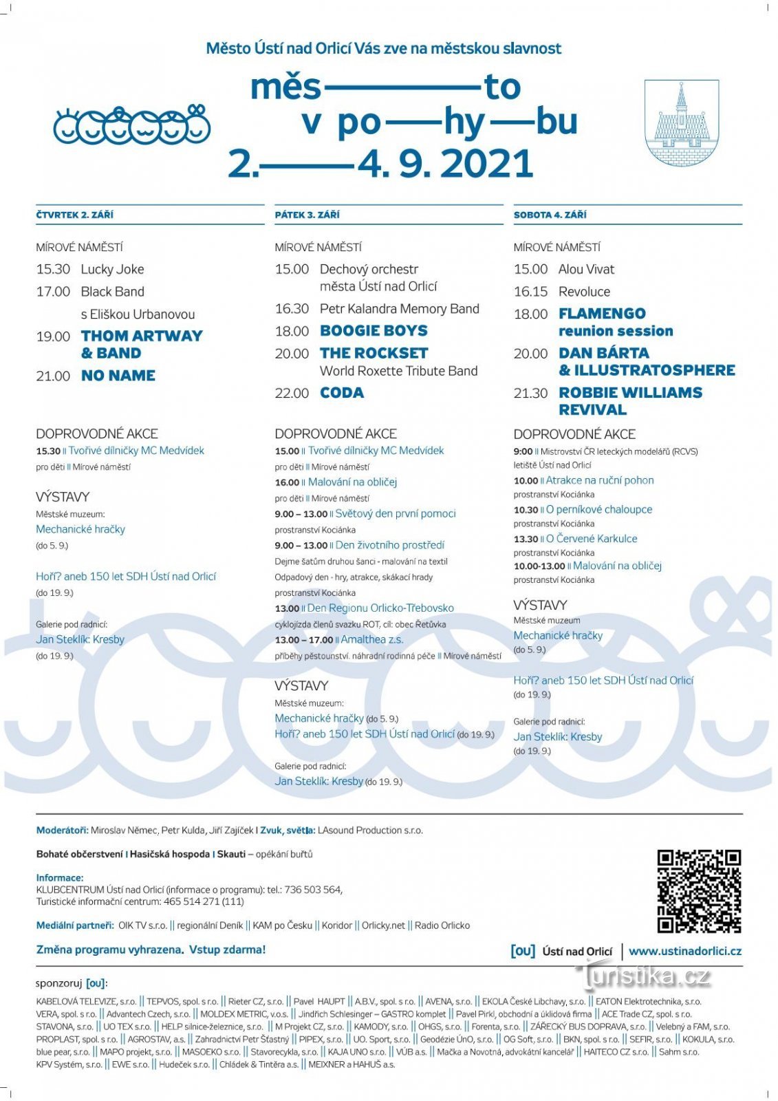 Ústí nad Orlicí bude žít od čtvrtka 2. do soboty 4. září městskými slavnostmi Město v pohybu – týden dobré pohody. V kalendáři akcí se v tomto termínu vyskytují poprvé a zcela výjimečně. Loňský 21. ročník musel být kvůli koronaviru bez náhrady zrušen a aby stejný osud nepotkal letošní slavnosti, došlo k jejich přesunu ze začátku června na první zářijový týden, kdy už shromažďování osob dovolují…