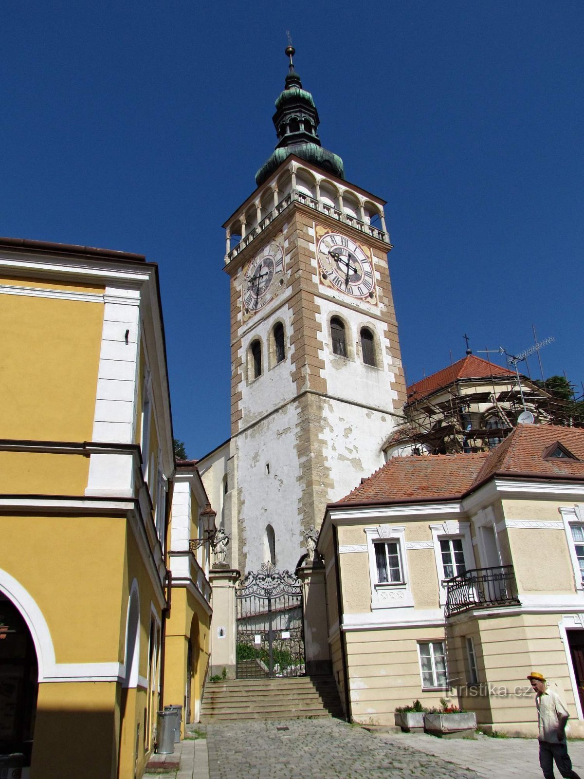 Při pohledu z hlavního mikulovského náměstí je tak utopen v okolní zástavbě, že je z něj vidět jen vysoká věž s ochozem. A protože ta se ze skály k nebi vypíná v těsné blízkosti zámku, může si neznalý návštěvník myslet, že je součástí pyšného feudálního sídla. Chrámovou loď kupodivu celou neuvidíme ani z maličkého Kostelního náměstí a jakýs takýs vjem o její podobě získáme až z vyhlídkových…