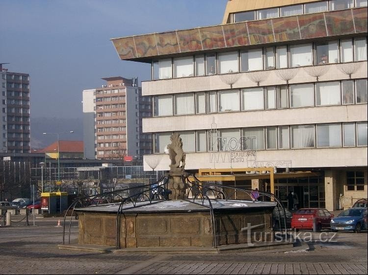 Ve starém Mostě na I. náměstí stála původně renesanční kašna z roku 1587 - dílo Vincence Petraše. Kašna byla zhotovena z oseckého pískovce vytěženého v kamenolomu na Salesiánské výšině. Ke kašně byla roku 1729 osazena Dietzova pískovcová plastika českého lva, vztyčeného na zadních nohách a předními tlapami přidržujícího kartuš se znakem města Mostu. Plastika lva byla několikrát od kašny oddělena…