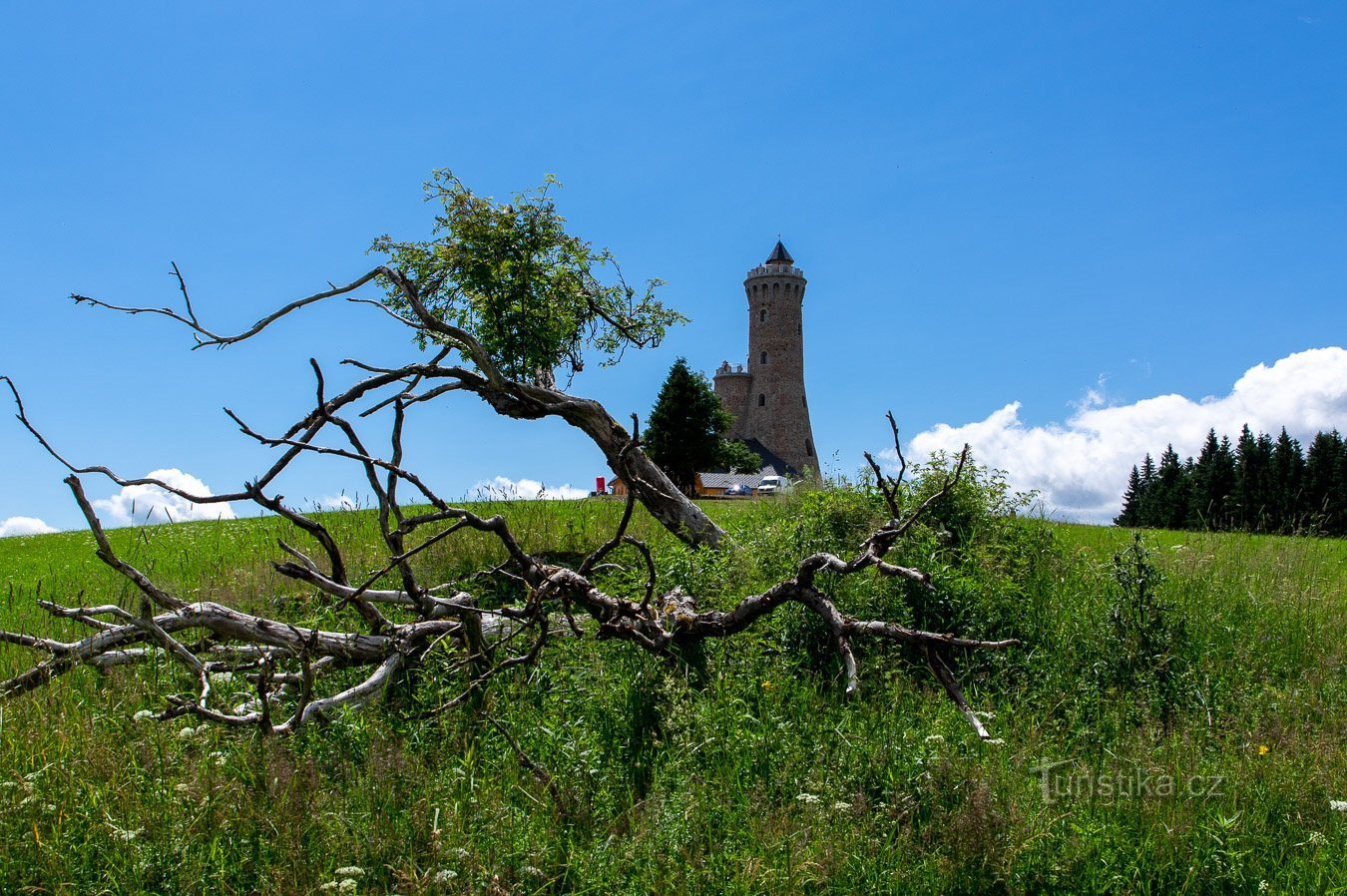 Dovolil jsem si vypůjčit podnázev propagačního letáčku, který je k dispozici všem návštěvníkům, kteří se vydají na Větrov v Rychlebských horách. Ta kamenná kráska se jmenuje (zatím) Dalimilova rozhledna (podle stavebníka). Nicméně její předobraz měl daleko honosnější název: Kaiser Wilhelm Turm, česky tedy věž císaře Viléma. Ten císař byl ale císařem německým, tedy ne naším (měli jsme Franze…
