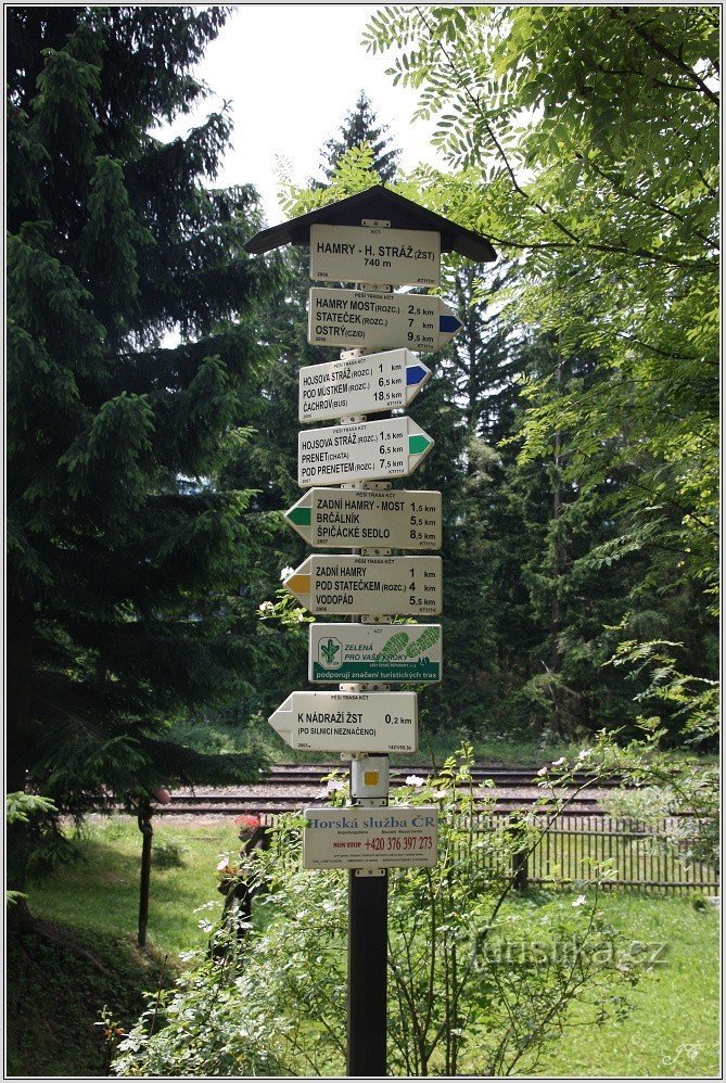 V Hojsově Stráži je dost penzionů a chat, a tak, pokud byste se tu octli na dovolené a chtěli se jen tak lehce projít, dám vám tip. Začneme třeba u hotelu Na Stráži (foto 1). Po modré značce sejdeme po silnici k její pravotočivé serpentině, lesem spadneme k další silnici a po ní vlevo dojdeme k nádraží Hamry - Hojsova Stráž (foto 2). Na rozcestníku (foto 3) si vybereme zelenou značku směr…