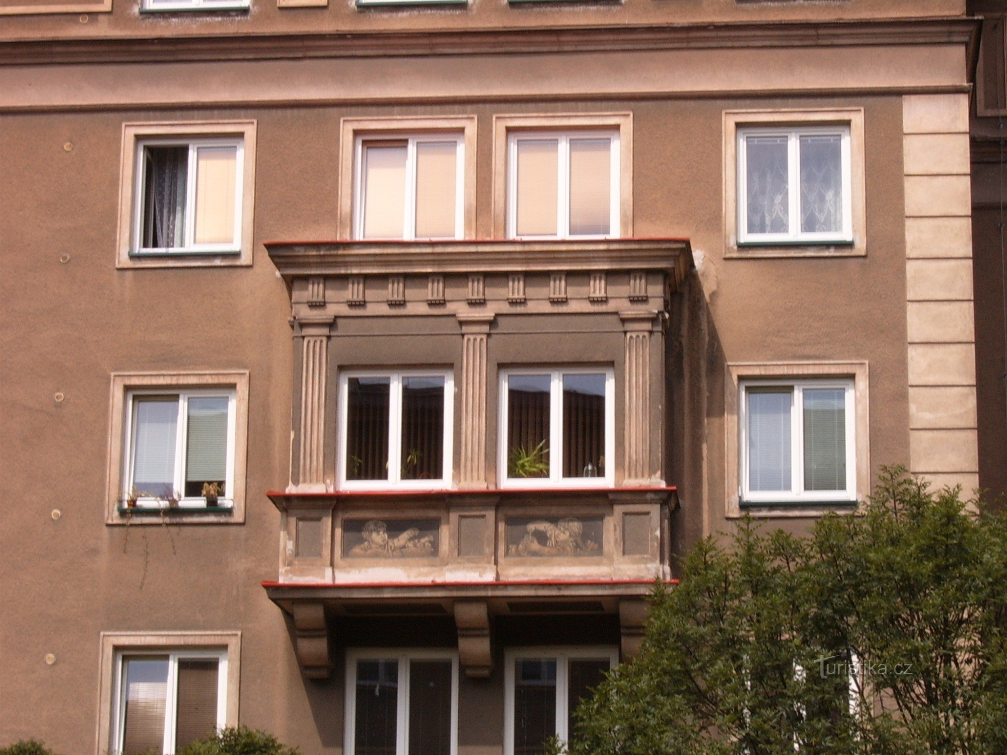 Jde o spojení bytových domů a obchodů s Věží nad průjezdem a figurálními sgrafity.